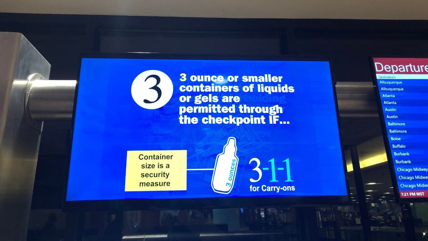 Znamení letiště vysvětluje pravidlo tekutiny. (USA Today)