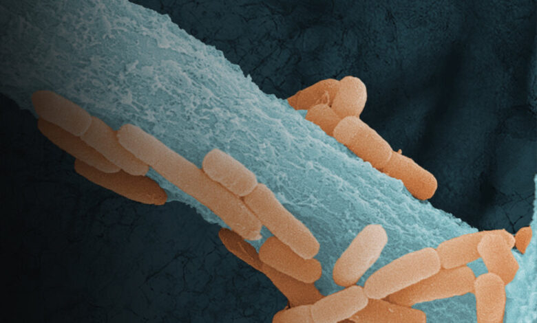 Růst Ligilactobacillus murinus (oranžový), člena myšího plicního mikrobiomu, podél hyfy plicní patogenní houby aspergillus fumigatus (modrá), s plicní tkáň v pozadí. Kredit: Liubov Nikitashina (Leibniz-Hki) a Sandor Nietzsche (EMZ-UKJ)