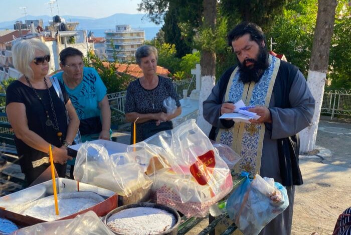 Koláč je poté přinesen do a Řecká pravoslavná církevkde je požehnáno během Vespers nebo večerních modliteb a poté rozděleno mezi farníky. Tradičně by nejméně devět lidí mělo jíst kousek koláče.