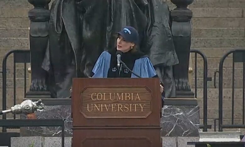 Před zahájením oslav 271. akademického roku Columbia University ve středu školní úředník řekl: „Účastí se všichni účastníci a hosté souhlasí s tím, že budou dodržovat obrysy povinností v univerzitních politikách, včetně pravidel chování univerzity, antidiskriminace a diskriminačních standardů a disciplíny. Budou požádáni o zrušení a mohou být požádáni o opuštění místa.“