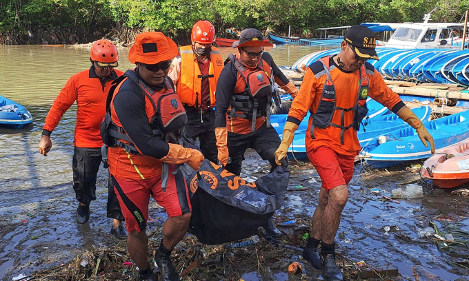 Na této fotografii vydané Indonésijskou národní pátrací a záchrannou agenturou (Basarnas) nesou záchranáři ve čtvrtek 11. září 2025.