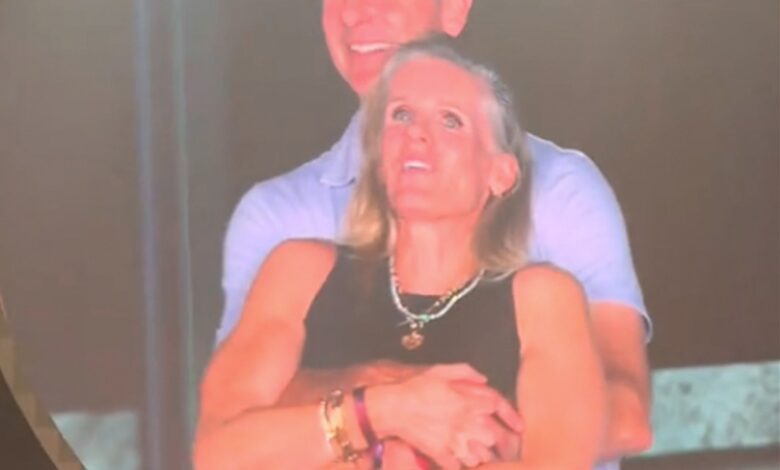 „Ach, podívej se na tyto dva,“ řekl zpěvák, když se kamera zastavila na útulně vypadajícím páru. Ale pak se muž vklouzl a žena, její ruce před její tvář, se otočila zády k kameře.