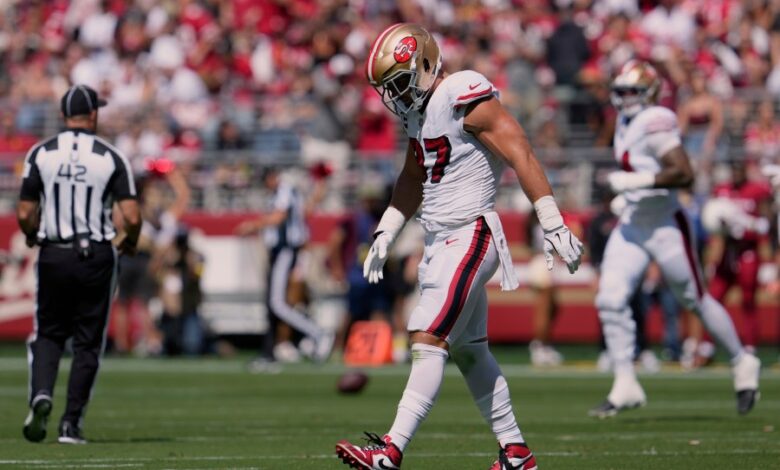 49ers ‚Nick Bosa EXTITS WIN vs. Cardinals s poraněním kolena, dává palec dolů davu