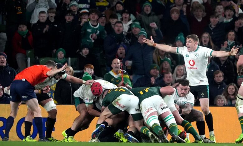 Opakovaná porušení Irska následovala po vnímané nespravedlnosti Springboks fly-half Sacha Feinberg-Mngomezulu se vyhnul brzké kartě za vysokou trefu na Tommyho O’Briena.