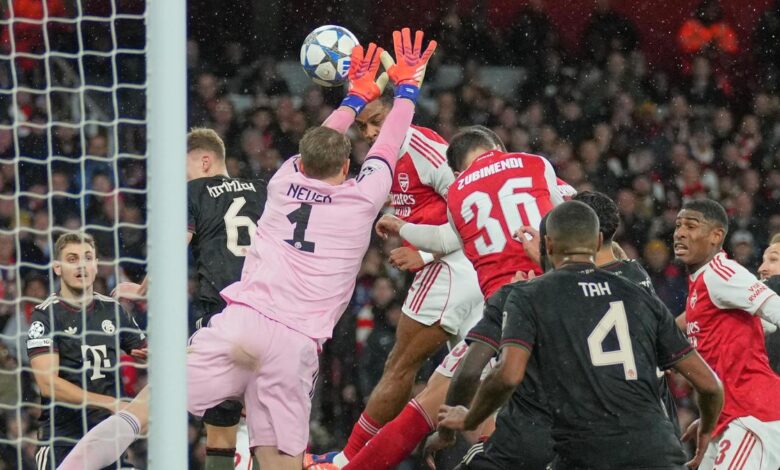 Jurrien Timber z Arsenalu, nahoře uprostřed, vstřelil úvodní gól během úvodní fáze fotbalového zápasu Ligy mistrů mezi Arsenalem a Bayernem Mnichov v Londýně 26. listopadu 2025. | Fotografický kredit: AP