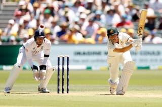 Jazyk se otočí o čtyři tečky, než se Khawajovi podaří otočit míček na nohu. Carey škrtne, aby ukázal na ještě jednu a australská stovka přichází.