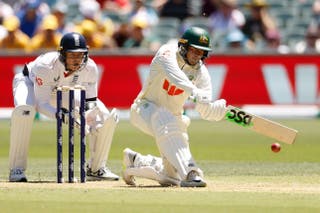 Jazyk se otočí o čtyři tečky, než se Khawajovi podaří otočit míček na nohu. Carey škrtne, aby ukázal na ještě jednu a australská stovka přichází.