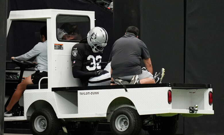 Bezpečnost Raiders v Las Vegas Lonnie Johnson Jr. utrpěla během tréninku v sobotu po srážce s obranným koncem Maxx Crosby zlomenou nohu .