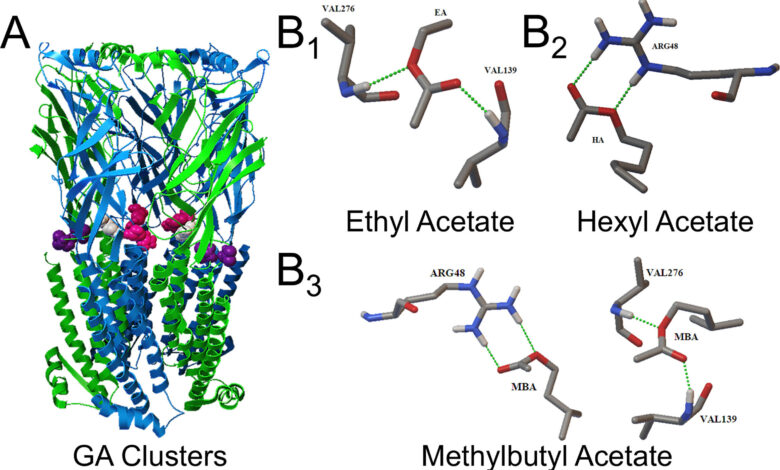 Výpočtové dokování zelených chemických příchutí jablek do plné délky a4p2 naChR (5KXI3). (A) Reprezentativní shlukování zelených jablkových příchutí dříve studovaných pomocí struktur plnění prostoru (hexylacetát, fialový; ethylacetát, růžový; methylbutylacetát, bílý). (B1-3) Výpočetní vazebné interakce zelených jablkových příchutí se zbytky podjednotky a4p2 nachr. Kredit: The Journal of Pharmacology and Experimental Therapeutics (2025). Doi: 10.1016/j.jpet.2025.103651