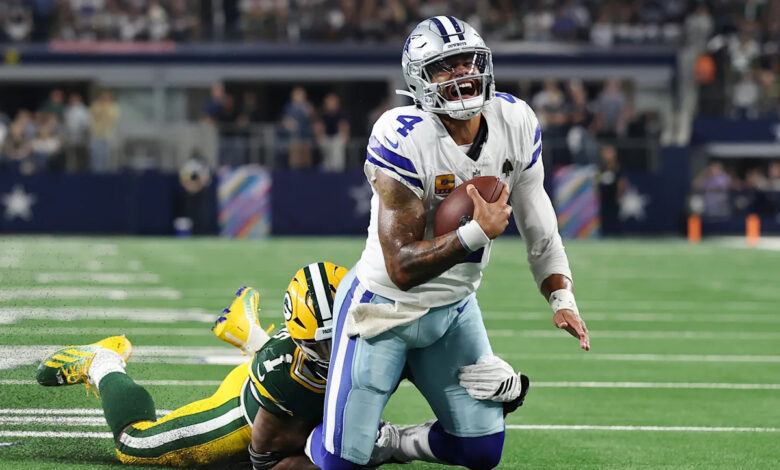 Cowboys stále sají vítr na průsmyku, jednou vyhodí lásku a přináší celkem sezónu na pět ve čtyřech hrách. A Prescott? Jednou byl propuštěn Packers-Parsons v pozdním přesčasovém okamžiku, který byl natolik klíčový, aby byl započítán jako dotyková hra, která by mohla změnit ztrátu v kravatu. Ne že by Prescott věřil, že se to počítalo.