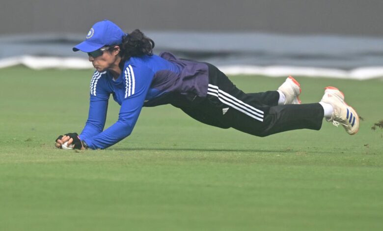 Indická Pratika Rawal během tréninku před kriketem Světového poháru ICC Women’s Světový pohár mezi Indií a Austrálií na mezinárodním kriketovém stadionu ACA-VDCA ve Visakhapatnam, 11. října 2025. | Fotografický kredit: Kr Deepak