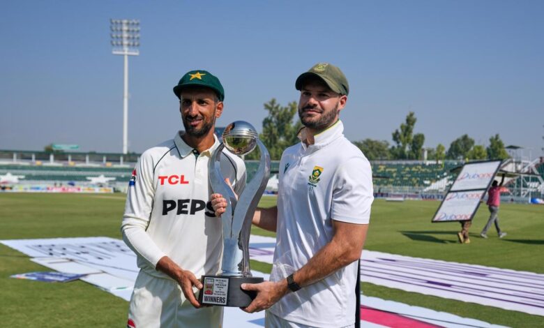 Pákistánec Shan Masood a Aiden Markram z Jihoafrické republiky se 23. října 2025 vyfotografovali s testovací trofejí v Rávalpindí | Fotografický kredit: AP