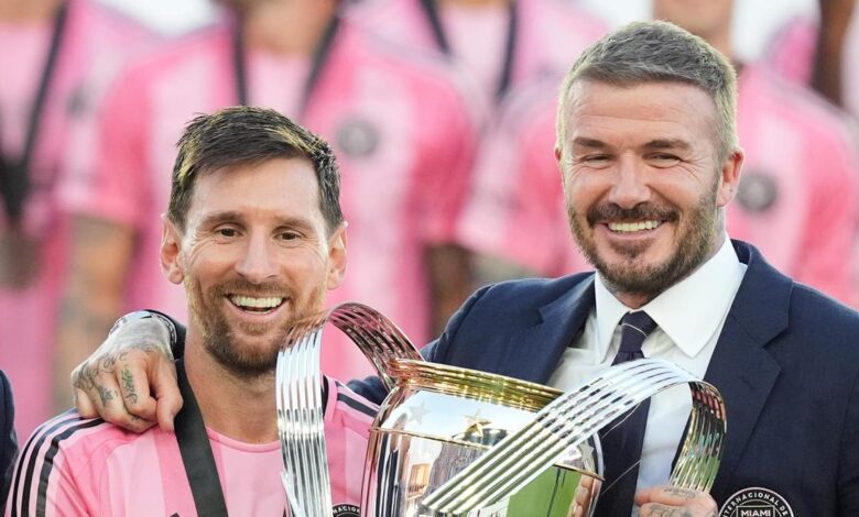 David Beckham pózuje s MLS Cupem s útočníkem Inter Miami Lionelem Messim ve Fort Lauderdale na Floridě 6. prosince 2025. | Fotografický kredit: AP