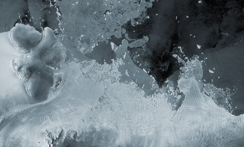Na tomto snímku zachyceném misí Copernicus Sentinel-1 2. března 2024 je vidět ledovec Thwaites v západní Antarktidě. Stále více a více ledu se stále odlamuje z nestabilního ledovce a sklouzne do moře.