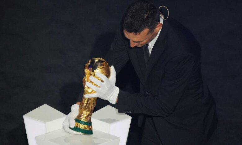 Trenér Argentiny Lionel Scaloni přináší trofej pro mistrovství světa na scénu během losování mistrovství světa ve fotbale 2026. Soubor. | Fotografický kredit: Reuters
