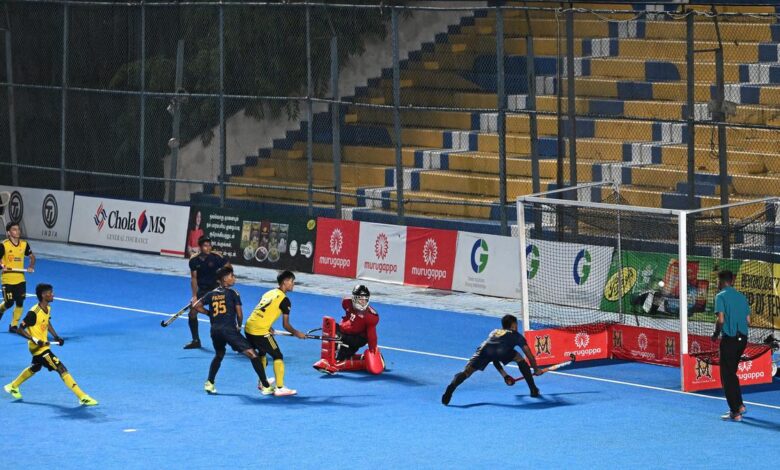 Selvaraj K v Indickém námořnictvu zaznamenává cíl proti Malajsii Junior National během 96. hokejového turnaje MCC-Murugappa Gold Cup na stadionu starosty Radhakrishnan, Chennai, v sobotu 12/7/2025. | Fotografický kredit: B. Velankanni Raj