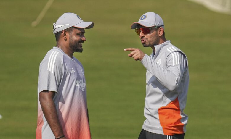 Sanju Samson s Jitesh Sharma během tréninku v předvečer prvního kriketového zápasu T20 série mezi Indií a Jižní Afrikou na stadionu Barabati v Cuttack, Urísa | Fotografický kredit: PTI