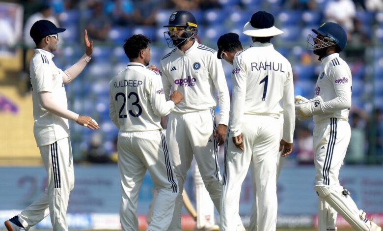 Indický Kuldeep Yadav slaví se spoluhráči poté, co vezme branku West Indies ‚Tevin Imlach ve třetí den druhého a posledního testovacího kriketového zápasu série mezi Indií a západní Indií, v Novém Dillí, neděle 11. října 2025. | Foto kredit: PTI