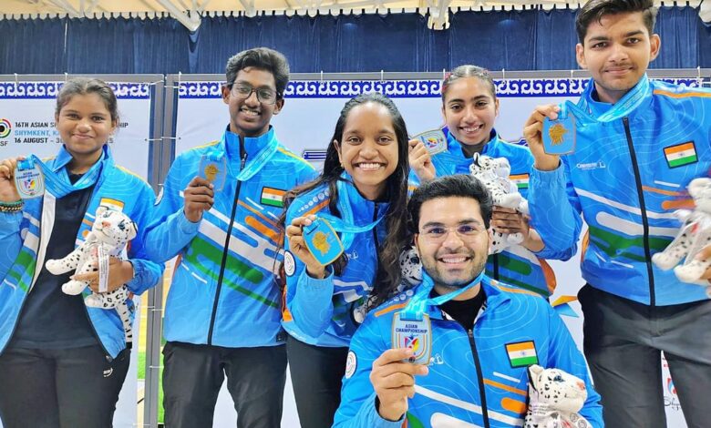 The three mixed air rifle gold medalists, Shambhavi Kshirsagar & Naraen Pranav, Elavenil Valarivan & Arjun Babuta, and Ameerah Arshad & Ansh Dabas, in the Asian shooting championship in Kazakhstan on Saturday. | Fotografický kredit: Zvláštní ujednání