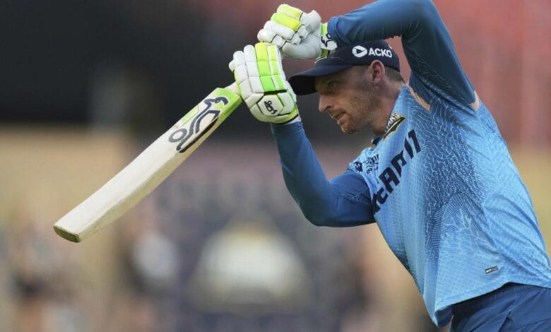Gujarat Titans ‚Jos Butler cvičí před zápasem IPL mezi Gujarat Titans a Sunrisers Hyderabad na stadionu Narendra Modi v Ahmedabad, Indie, pátek 2. května 2025. | Foto kredit: AP