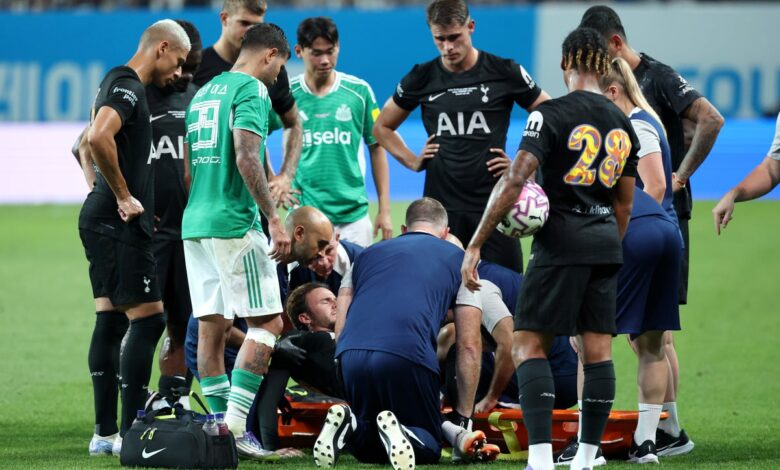 James Maddison Nechala Tottenhamova preseason přátelská s Newcastle United na nosítkách s tím, co se zdálo být vážným zraněním poté, co během hry v Jižní Koreji, která se dostala na zem, držel koleno.