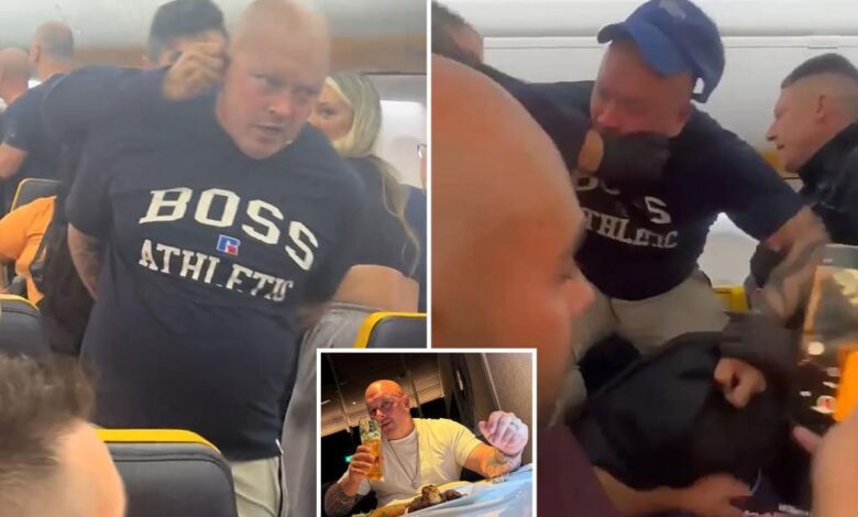 Divoké video ukazuje opilého britského otce bojujícího s policií, který ho pak odtáhl z letadla ucho poté, co se údajně pokusil otevřít nouzové dveře v polovině letu.