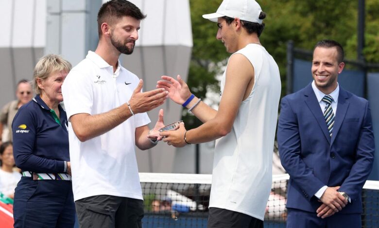 Ivan Ivanov z Bulharska (R) dostává svou trofej poté, co porazil Bulharsko Alexandra Vasileva z Bulharského posledního zápasu singlů juniorských chlapců v den čtrnáct z roku 2025 US Open v USTA Billie Jean King National Tennis Center dne 6. září 2025 v New York City. | Foto kredit: AFP