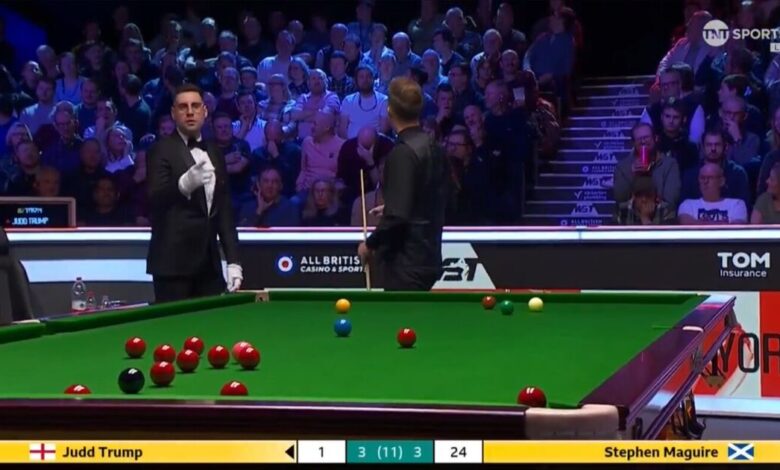Trump poté dodal: „Jo, musí jít,“ a znovu se podíval na stůl, aby se připravil na svůj výstřel. Napětí se zhoršilo, když Trump konečně zahrál svůj úder a v mučivým způsobem chyběl, aby poskytl Maguireovi výhodu, než zavrtěl hlavou, když se vrátil na své místo.