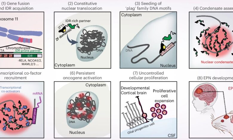 V ependymomu kondenzáty sestavují molekuly odpovědné za expresi genu. Uvnitř kondenzátů vede část ZFTA fúzního proteinu komplex k DNA kódujícím určité onkogeny. Vědci ukázali, že tento abnormální proces je nezbytný pro tvorbu ependymomu, což naznačuje, že by mohl být narušen pro terapeutický účinek.