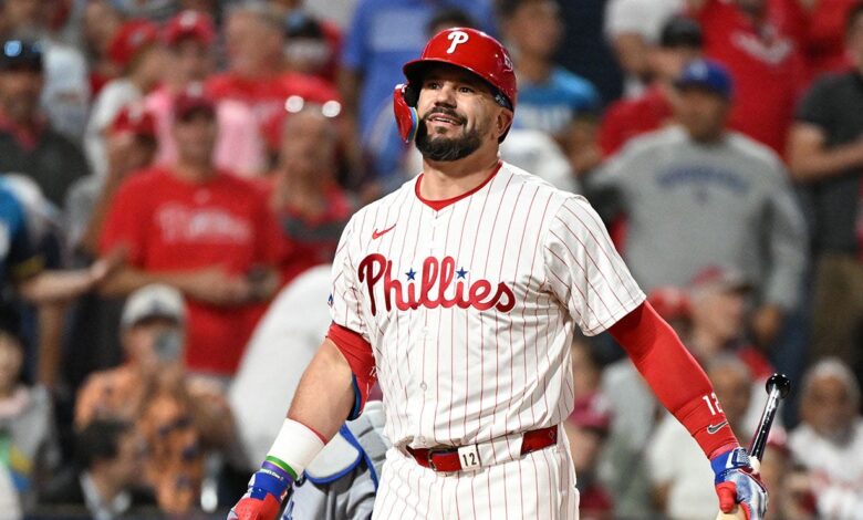 Philadelphia Phillies určený hitter Kyle Schwarber reaguje na zasažení proti Los Angeles Dodgers v osmé směně během hry 2 série National League Division v Citizen Bank Park. (Eric Hartline/Imagn obrázky)