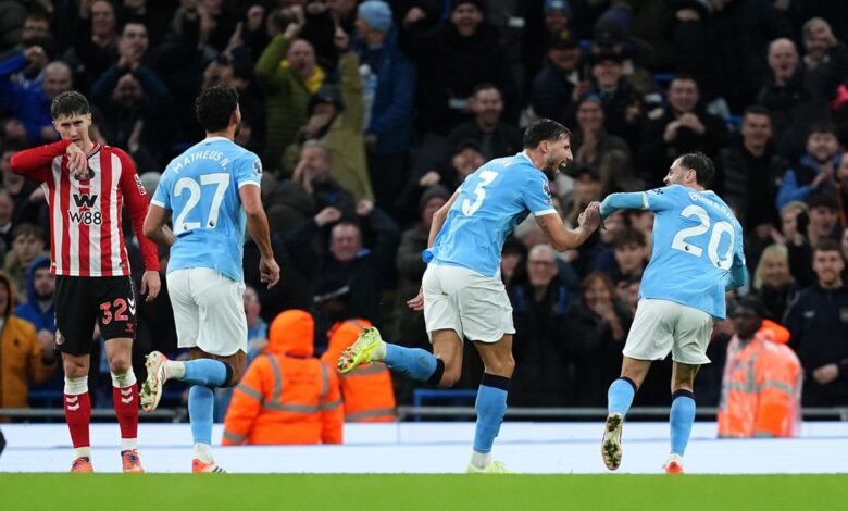 Střední obránci Ruben Dias a Pokud Guardiol soubor Pep Guardiola‚s strana na cestě s quickfire double před přestávkou na Etihad Stadium.