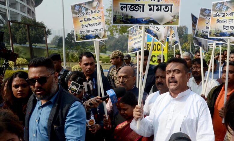 Předseda opozičního shromáždění Západního Bengálska Suvendu Adhikari se spolu s BJP MLA zúčastnil protestního shromáždění proti nedávnému špatnému hospodaření mimo hřiště Vivekananda Yuba Bharati Krirangan (VYBK) během turné fotbalové hvězdy Lionela Messiho GOAT India Tour ve městě v Kalkatě 17. prosince 2025. Fotografický kredit: The Hindu
