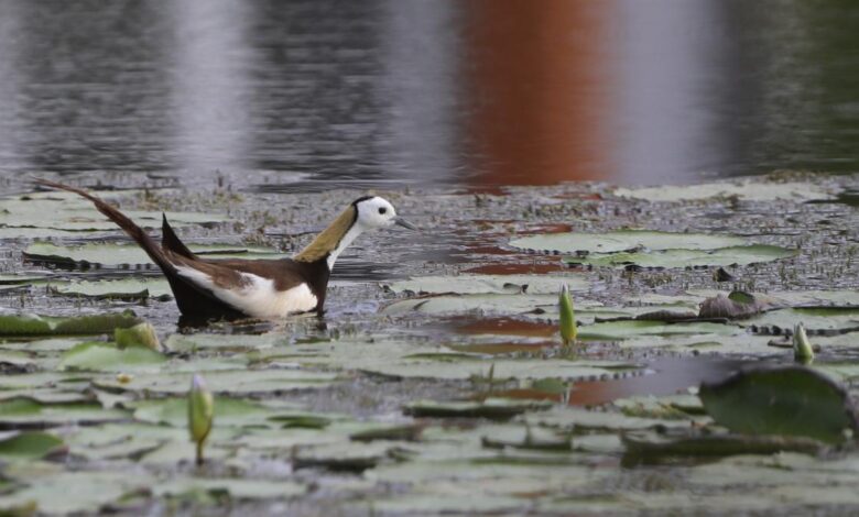 Dva bažantní Jacanas, jeden v plném rozsahu a druhý v částečném chovu peří, na bažinaté záplatě v Semmancherry již 22. dubna 2025. Foto: Prince Frederick | Foto kredit: Prince Frederick