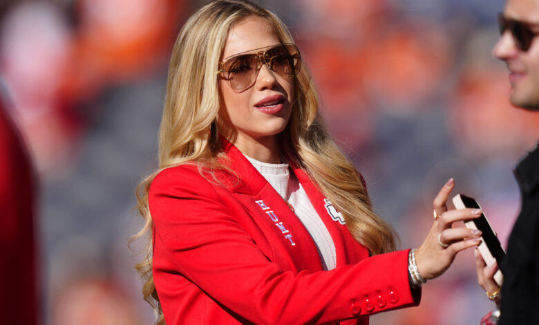 Náčelnická dědička Gracie Huntová otočí hlavy v červené minisukni a kovbojských botách s přítelem Derekem Greenem za Chiefs vs. Broncos