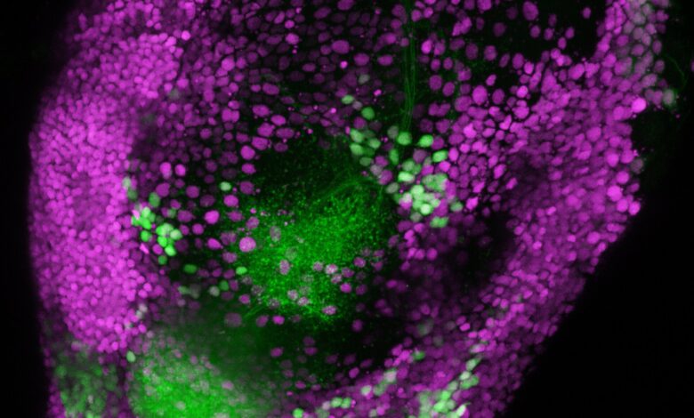 Optogeneticky značené boční neurony rohů (zelené) v moři neuronů v mozku (purpurová). Kredit: Riken