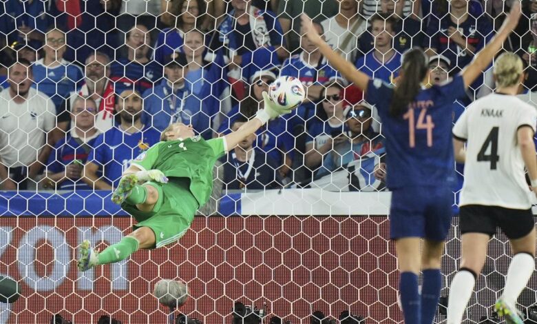 Německý brankář Ann-Katrin Berger zachrání během ženského čtvrtfinále Euro 2025 fotbalový zápas mezi Francií a Německem v St. Jakob-Park v Basileji ve Švýcarsku, sobota 19. července 2025. | Foto kredit: AP