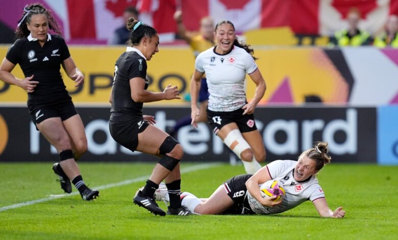 Kanada s plně zpět Julia Schell položí hlavu dolů a jde na senzační běh na území Nového Zélandu a přivede Kanadu zpět do poloviny soupeře.