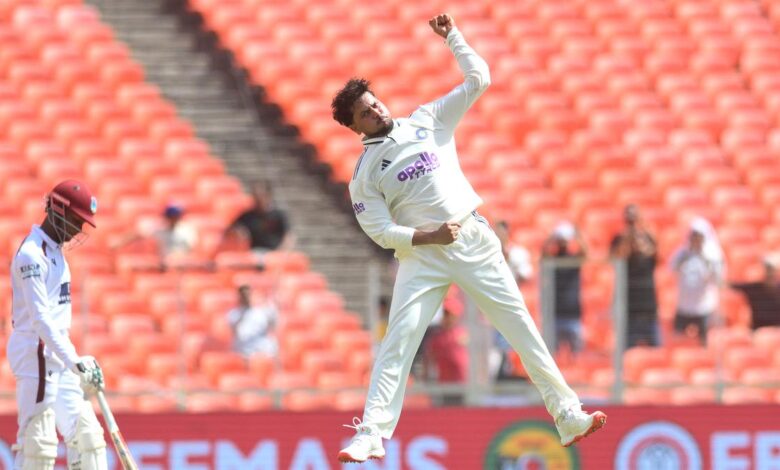 Kuldeep Yadav slaví branku kapitána západní Indie Roston Chase. | Foto kredit: Vijay Soneji