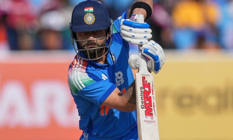 Virat Kohli hraje ránu během druhého jednodenního mezinárodního kriketového zápasu mezi Indií a Novým Zélandem v indickém Rajkotu, středa 14.…