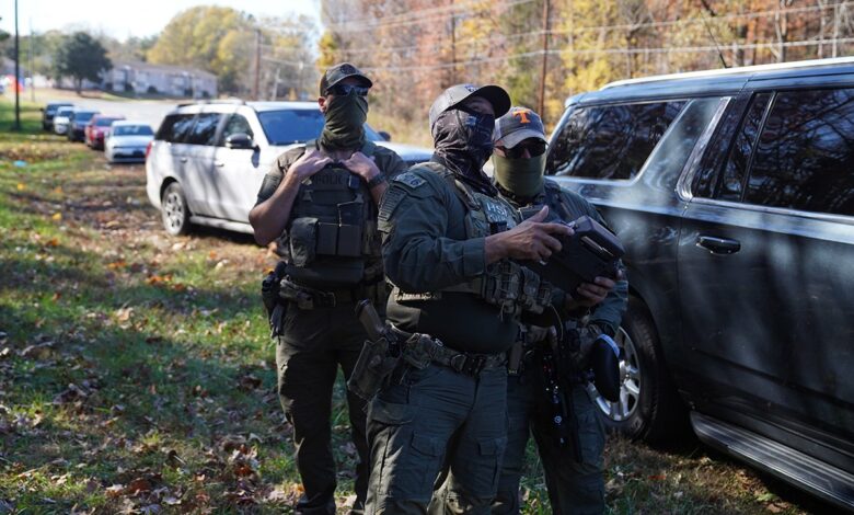 SOUBOROVÁ FOTOGRAFIE: Důstojníci oddělení pro vyšetřování vnitřní bezpečnosti používají dron při pátrání po dvou jedincích, kteří uprchli z místa poté, co byli 16. listopadu 2025 v Charlotte v Severní Karolíně zastaveni při prodeji květin na kraji silnice. (Ryan Murphy/Getty Images)