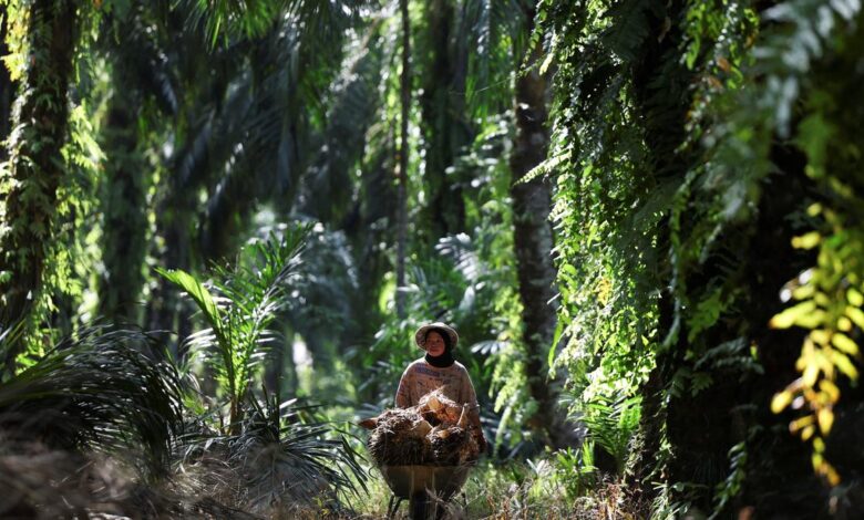 Pracovník tlačí kolečko nabitý olejovými palmami na plantáži v Ijoku v Malajsii, 14. května 2025. | Foto kredit: Reuters