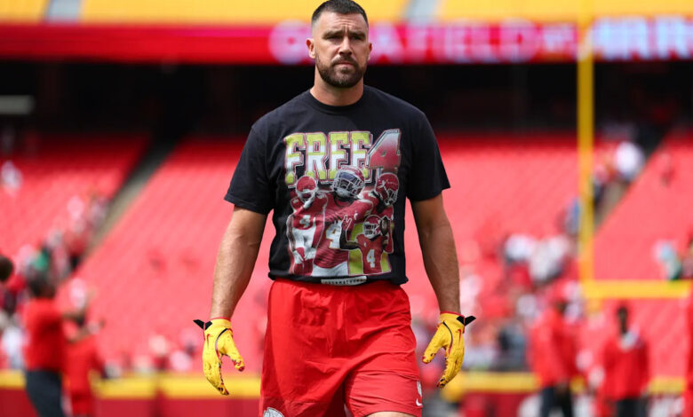 Travis Kelce a a Náčelníci města Kansas City spoluhráč na sobě trička „zdarma 4“, s odkazem na zavěšenou rýži vyrážka, Otřel mnoho lidí špatně před nedělní hrou.