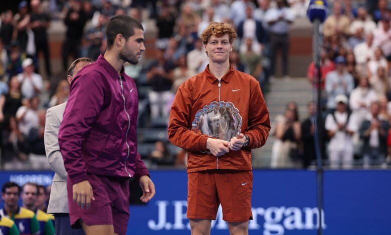Když se kamery začaly odcházet a obřad trofeje se zmizel, Carlos Alcaraz obdržel klepnutí na rameno. Otočil se, aby našel Jannik Sinnerkdo vyšplhal po schodech nahoru na pódium a nabídl nové US Open Champion and World č. 1 jeho blahopřeji naposledy.