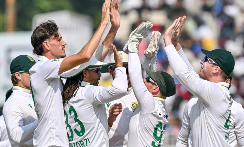 Jihoafričtí hráči slaví branku v den 3 prvního testu proti Indii v Kalkatě 16. listopadu 2025 | Fotografický kredit: KR Deepak