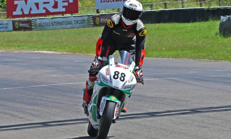 Rahil Pillarisetty z Hyderabadu dosáhl dvojnásobku v pro-stock 301-400cc, aby dokončil čtvrté kolo MRF MMSC FMSCI Indian National Motorcycle Racing Championship 2025 na vysoko na Madras International Circuit, zde v neděli (5. října 2025).