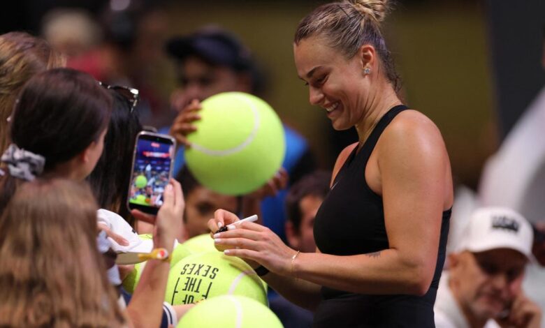 Běloruska Aryna Sabalenková podepisuje fanouškům autogramy v Coca-Cola Areně, Dubaj, Spojené arabské emiráty, 28. prosince 2025. | Fotografický kredit: Reuters