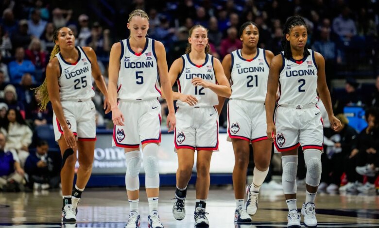 Sarah Strong, KK Arnold, Kayleigh Heckel a další reagují, když UConn’s Ice Brady předvádí její nejnovější outfit
