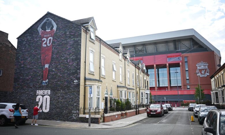 Diogo Jota dnes večer budou v první hře Premier League v Anfieldu od jeho smrti v červenci. Tato krásná nástěnná malba nyní zaplňuje zeď na procházce k zemi: