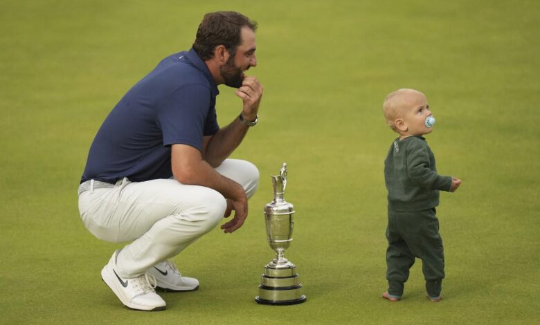 Scottie Scheffler ze Spojených států drží Trophy Claret Jug Trophy, když jeho syn Bennett stojí na 18. zelené po vítězství na golfovém šampionátu British Open v Golfovém klubu Royal Portrush Golf Club v Severním Irsku, neděle 20. července 2025. | Foto kredit: AP