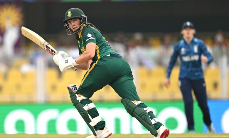 Akce Tazmin Birts v Jihoafrické republice proti Anglii v semifinálovém zápase Mistrovství světa v kriketu ICC žen v Guwahati 29. října 2025. | Fotografický kredit: RITU RAJ KONWAR